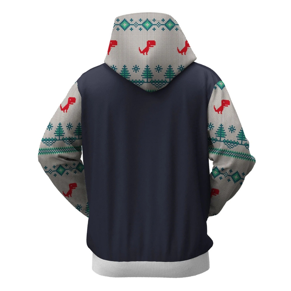 Spread holiday humor with the Tree Rex Hoodie, featuring a custom made design, crafted from 100% polyester. The funny graphic of a Santa dinosaur with twinkle lights was designed by our resident artists.